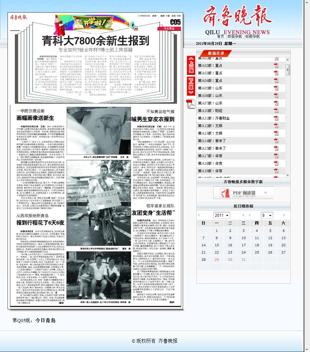 8月28日,做爱电影 2011级新生261人报到入学,8月29日《齐鲁晚报》以《画幅画像送新生》为题对做爱电影 迎新情况进行了报导。