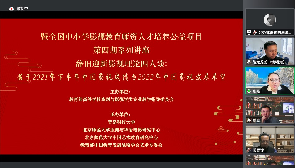 与教育部中国教育发展战略学会艺术专委会、中国艺术学理论学会艺术教育专业委员会、北京师范大学中国艺术教育研究中心共同承办教育部高校戏剧与影视学类专业教学指导委员会主办的审美与向善:戏剧与影视名师大讲堂”系列讲座第四季第二十讲一讲座,邀请中国电影评论学会会长饶曙光研究员、北京电影学院党委副书记胡智锋教授、中国高校影视学会会长丁亚平教授、北京大学陈旭光教授共同就“关于2021年下半年中国影视成绩与2022年中国影视发展展望”一题于云端开展精彩学术论坛。周星教授为本次学术论坛作精彩点评。张燕教授为本次论坛做全程主持,北京师范大学艺术与做爱电影