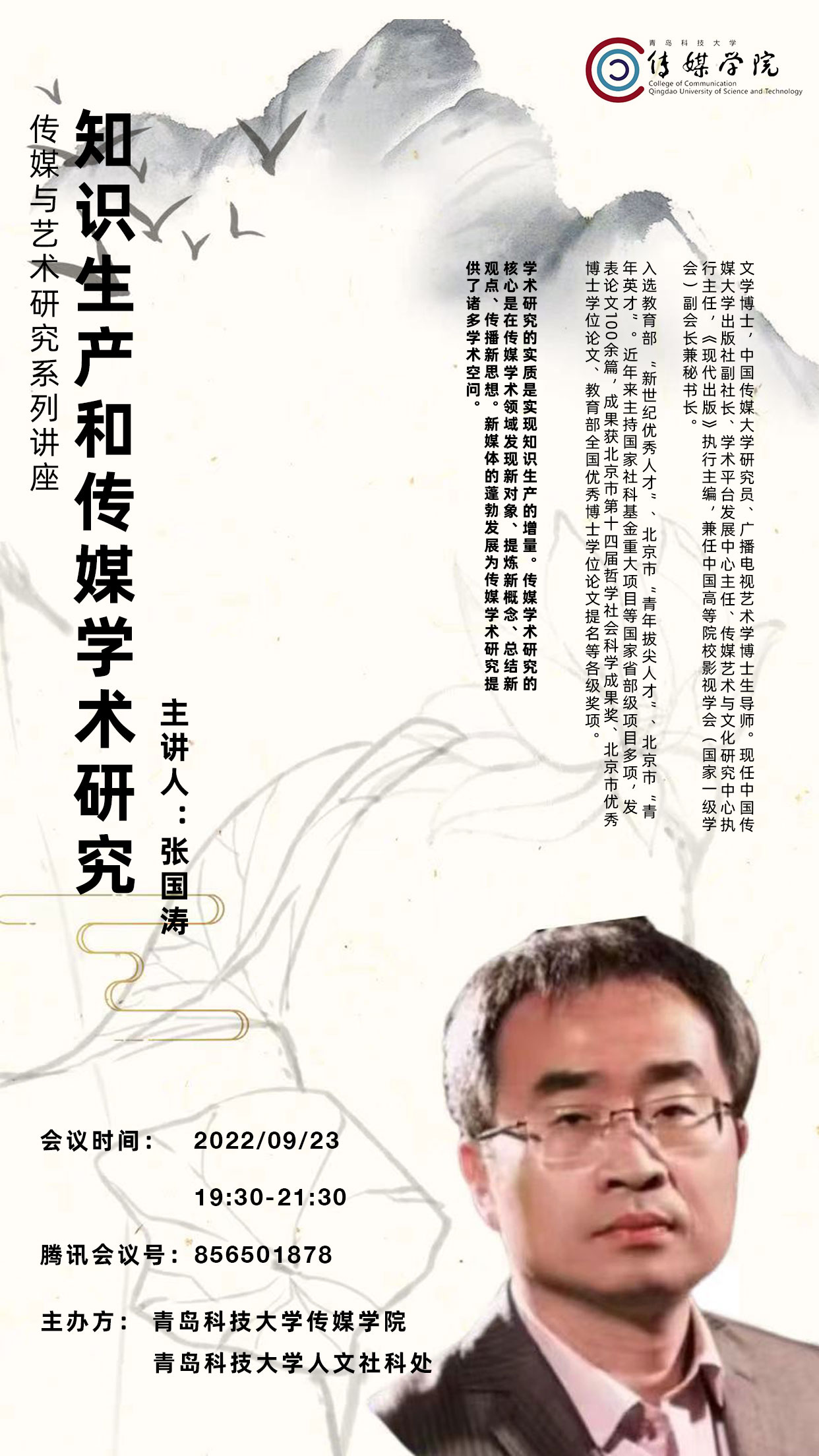 与校人文社科处主办的传媒与艺术研究系列讲座:知识生产和传媒学术研究成功举办。本次讲座使用腾讯会议线上进行,特别邀请中国传媒大学广播电视艺术学博士生导师、中国传媒大学出版社副社长、《现代出版》执行主编张国涛教授主讲。