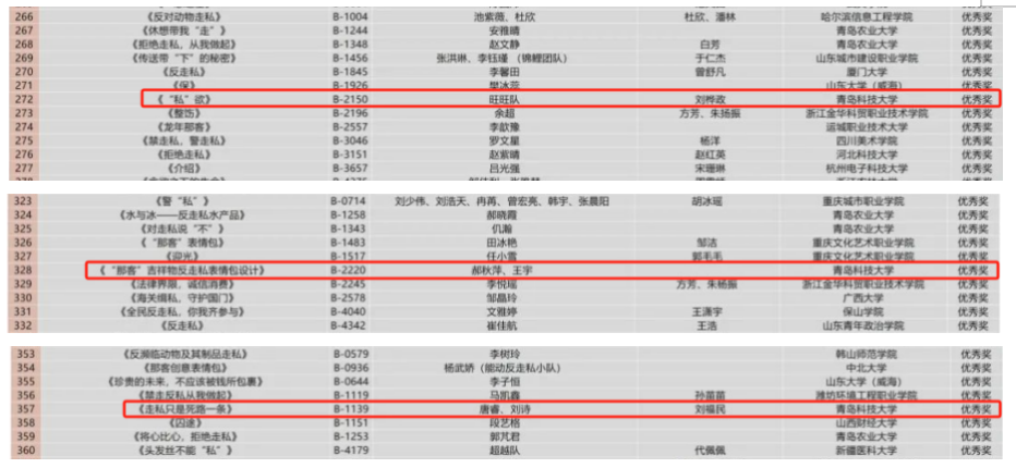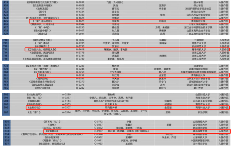 学生所提交的作品《“私”欲》《“那客”吉祥物反走私表情包设计》《走私只是死路一条》获得优秀奖;作品《“象”走私开炮》《万物皆共生,相煎何太急》《歧途》《走私行动》《灰烟散尽》获入围作品奖。