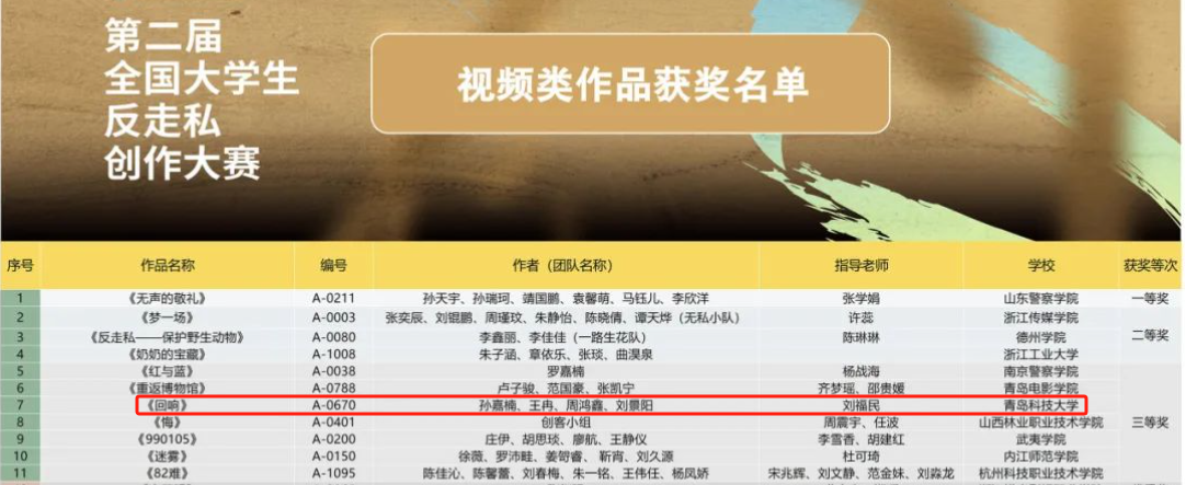 学生孙嘉楠、王冉、周鸿鑫、刘景阳创作的作品《回响》获视频类三等奖(全国仅7项)。
