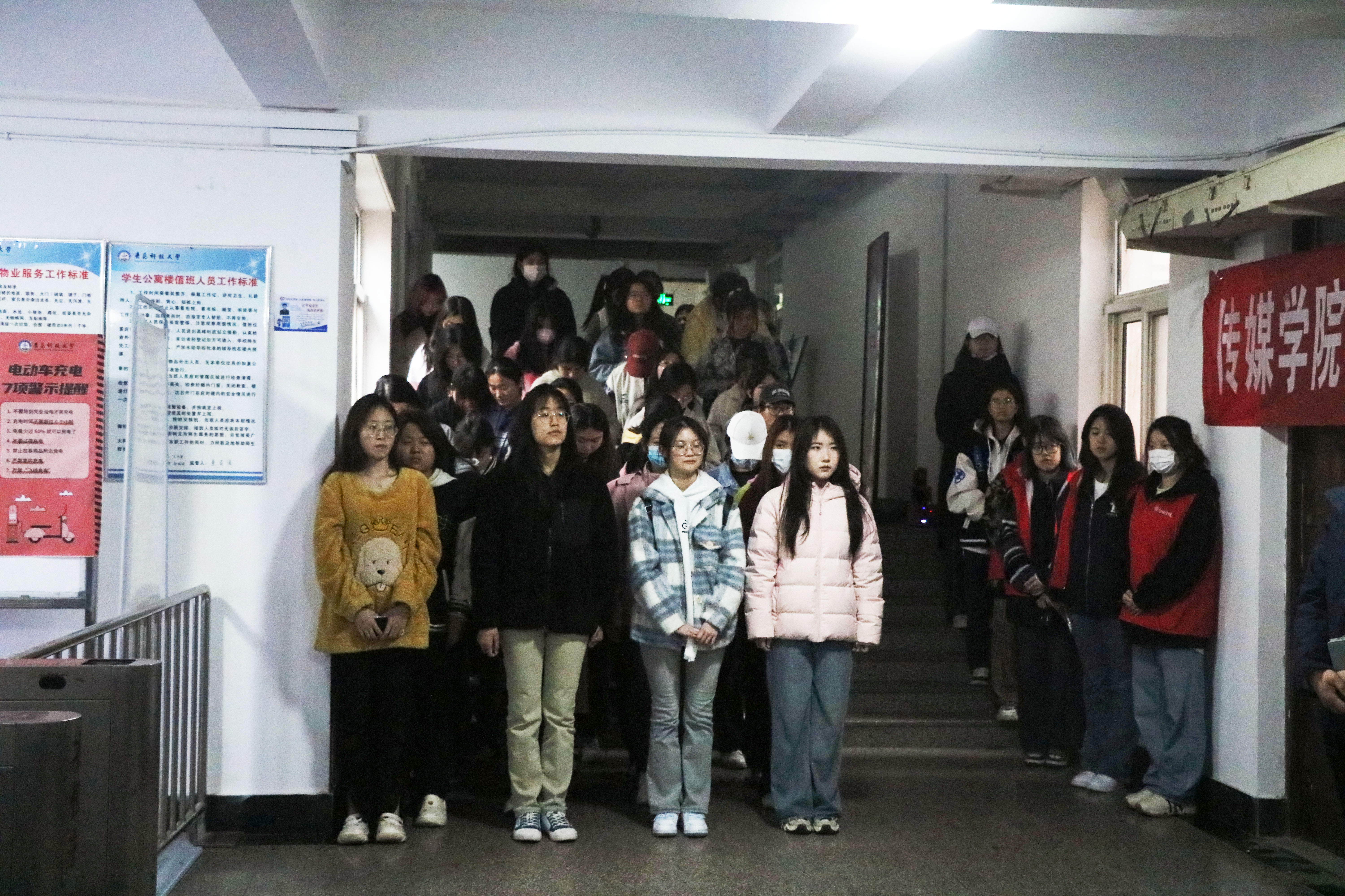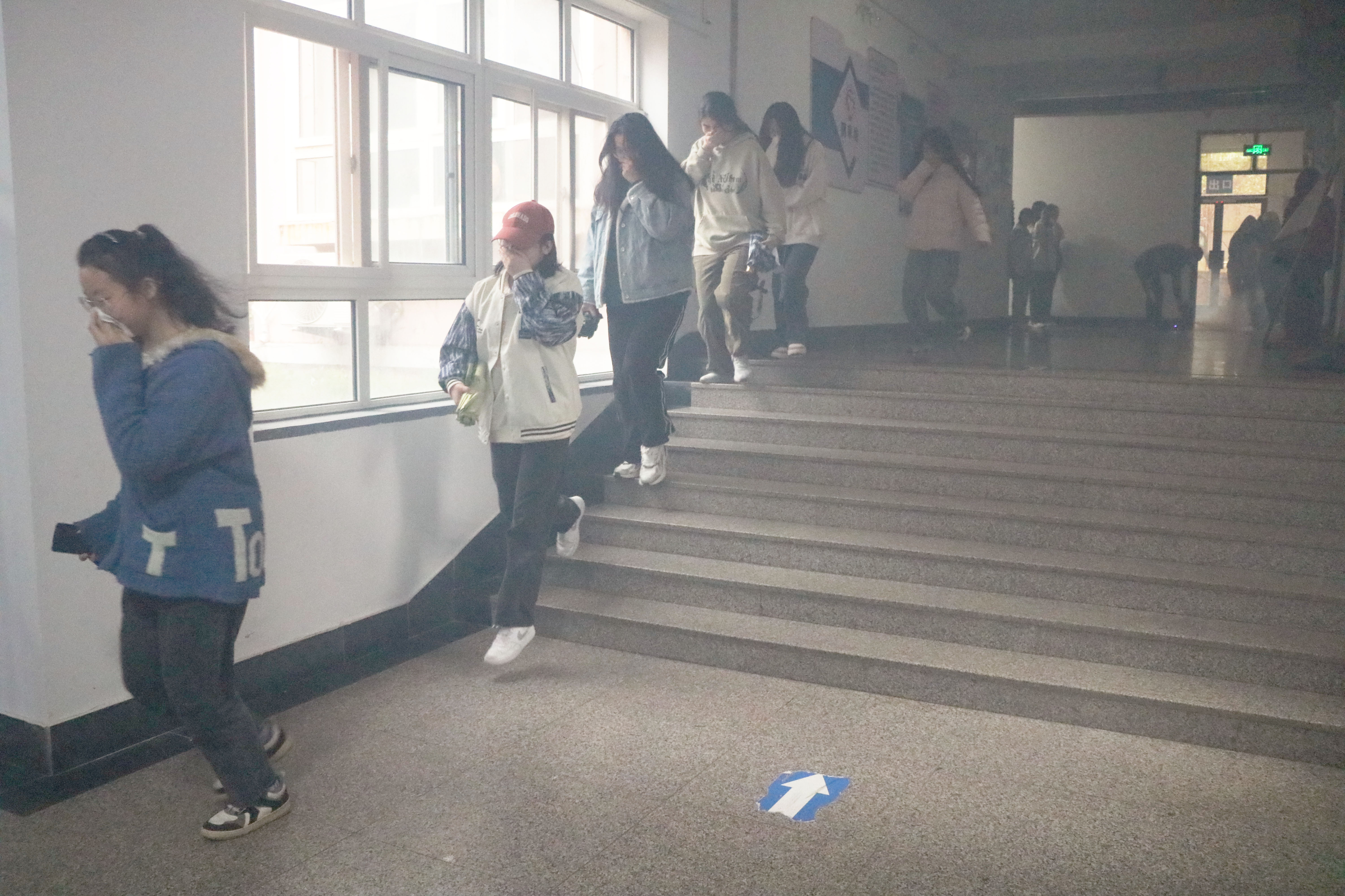 随着火警警报响起,同学们根据疏散路线捂住口鼻有序撤离,迅速疏散到平台空地。整个疏散过程严肃、认真、迅速,全程组织有序,学生全部安全撤离。