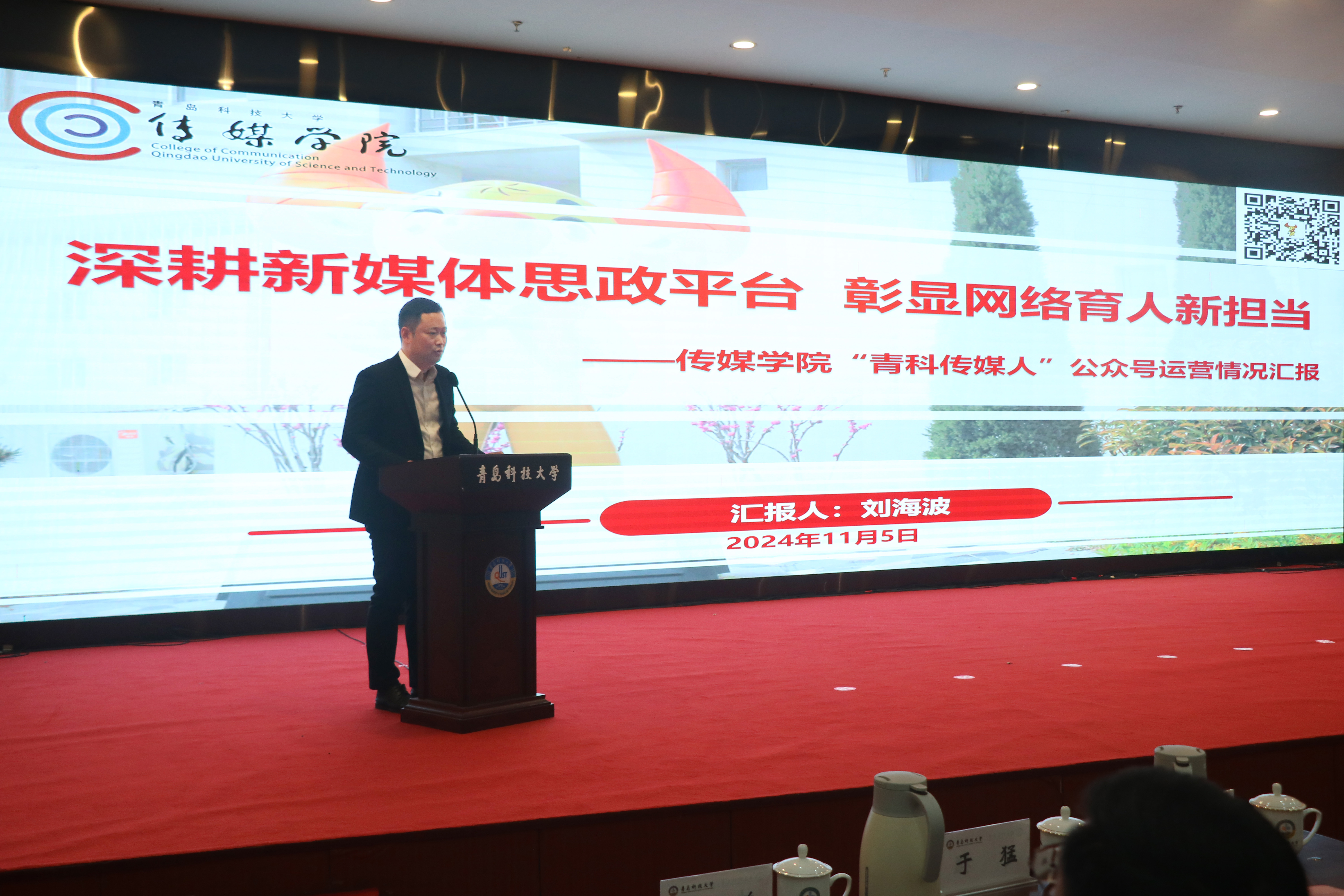 刘海波以“深耕新媒体思政平台 彰显网络育人新担当”为题,系统介绍了学院网络思政育人矩阵和媒体平台内容架构,并围绕“青科传媒人”微信公众号建设运营情况,从内容全,打造多元信息平台;队伍精,夯实思政育人基础;格局新,筑牢网络育人阵地等方面作工作交流。据悉,学院聚力打造集网站、官微、易班和抖音等平台的立体化网络思政育人矩阵,学院网站累计发布新闻1439篇,抖音阵地发布作品257篇,易班平台发布动态120条;“青科传媒人”公众号创立于2017年,现有关注者6786位,累计发文1179篇,累计阅读量120万+,着力打造集思想引领、教学科研、风采展示、信息查询等于一体的网络育人综合体。