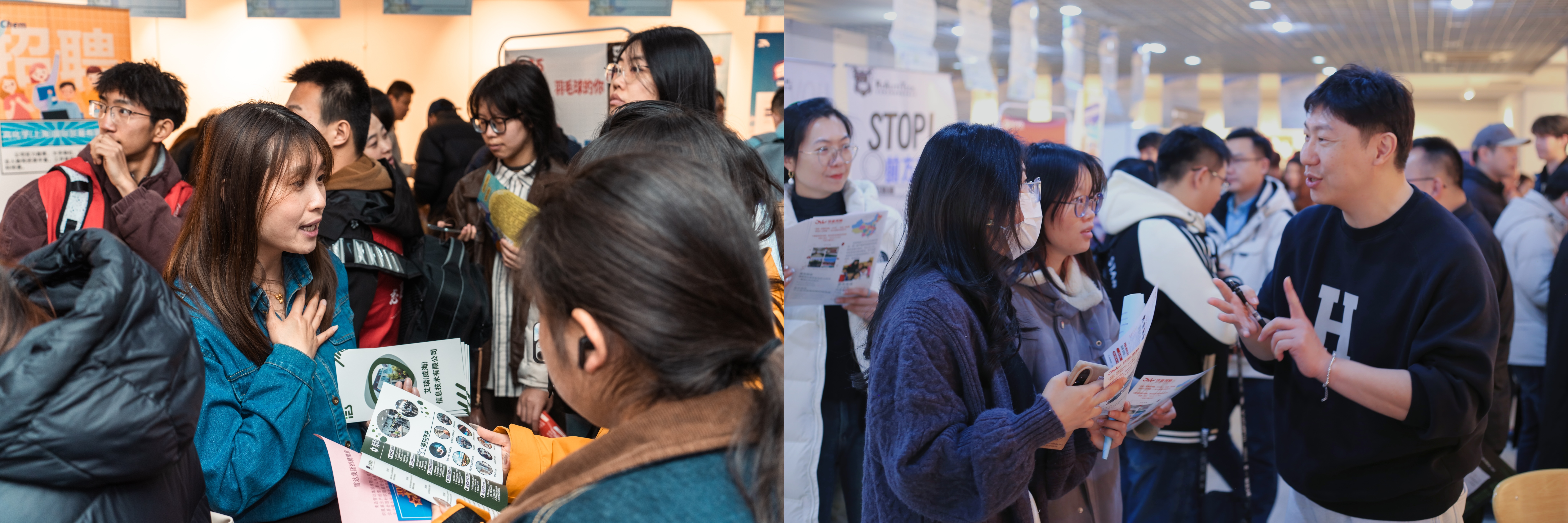 、艺术学院、外国语学院、体育学院联合邀请了省内外近百家用人单位关注报名,通过精准摸排学生就业意向需求,精心筛选专业对口单位到校招聘,涵盖了新东方、学而思、澎聚传媒、歌尔创客、万声通讯、安踏体育等企业,覆盖文化传媒、教育培训、外贸物流、制造零售等领域1000余个就业岗位,为毕业生高质量就业提供保障。在招聘会现场,各学院毕业生就岗位职责、工作要求、发展前景等与意向单位交流自荐并投递简历,部分非毕业学生也提前来了解用人单位招聘流程、应聘条件和岗位需求,现场气氛热烈、人潮涌动,陆续有1500余名学生参加。