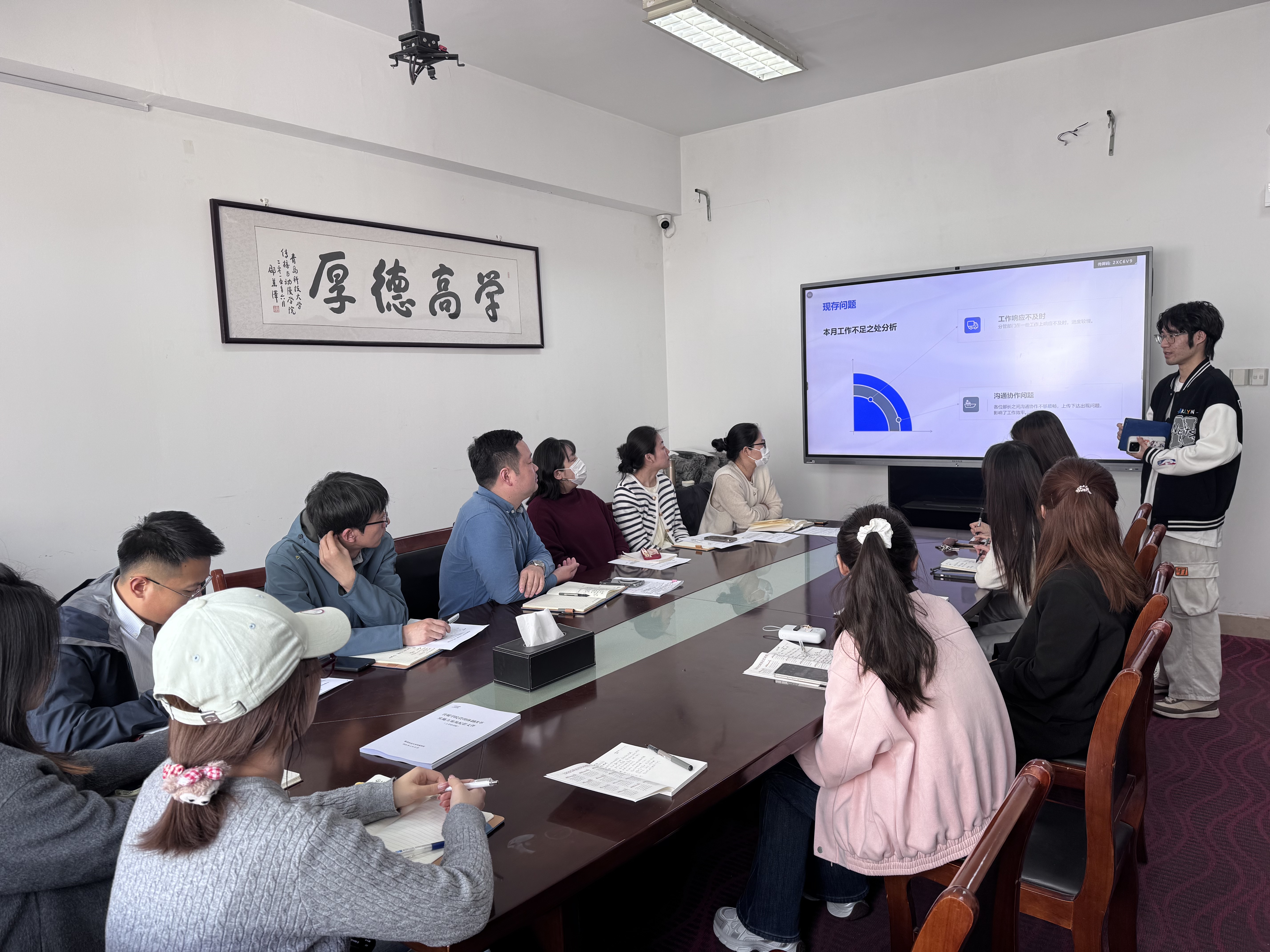 会上,各年级辅导员从党建引领、学风建设、心理健康、安全稳定、就业指导和共青团工作等方面展开,通过数据分析和案例复盘,现场提出问题,共商解决方案,形成“发现问题—共商对策—落实整改”的闭环管理机制。各学生骨干通过PPT进行汇报交流,他们聚焦岗位职责,总结经验做法,提出问题需求,在师生交流中找答案,在互学互鉴中促提升。