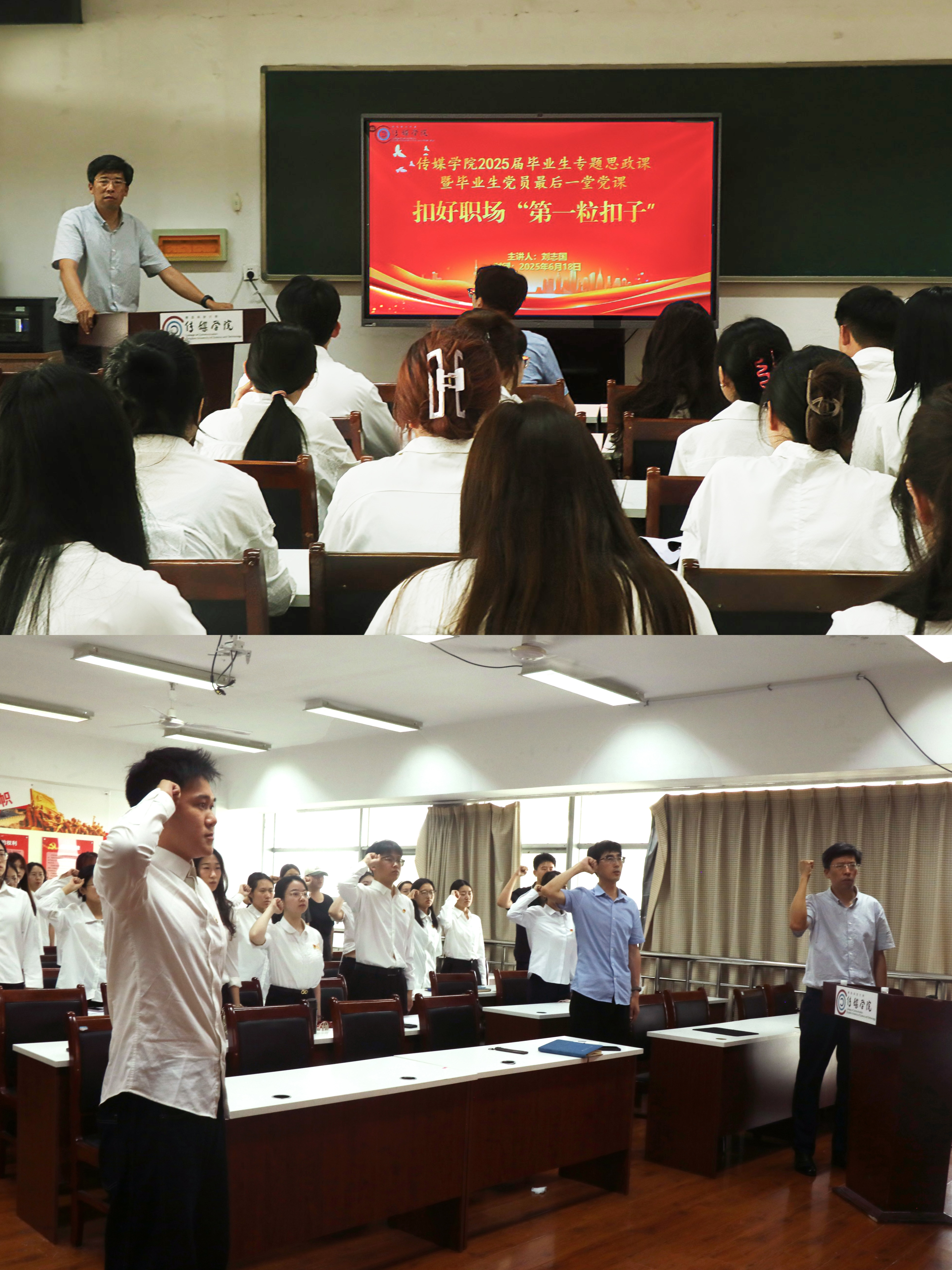 深化思政教育,强化理想信念。学院党委书记刘志国以扣好职场“第一粒扣子”为题,为2025届毕业生讲授专题思政课暨毕业生党员最后一堂党课,并带领毕业生党员重温入党誓词,签署《廉洁从业承诺书》。刘志国结合党的二十大报告中关于“党风廉政建设和反腐败斗争永远在路上”等重要论述,结合自身经历及典型案例,深刻剖析当前毕业生面临的职场廉洁风险与挑战,引导毕业生发扬“科大精神”、践行“橡胶品格”、贯彻“五有理念”,切实扣好职场“第一粒扣子”。
