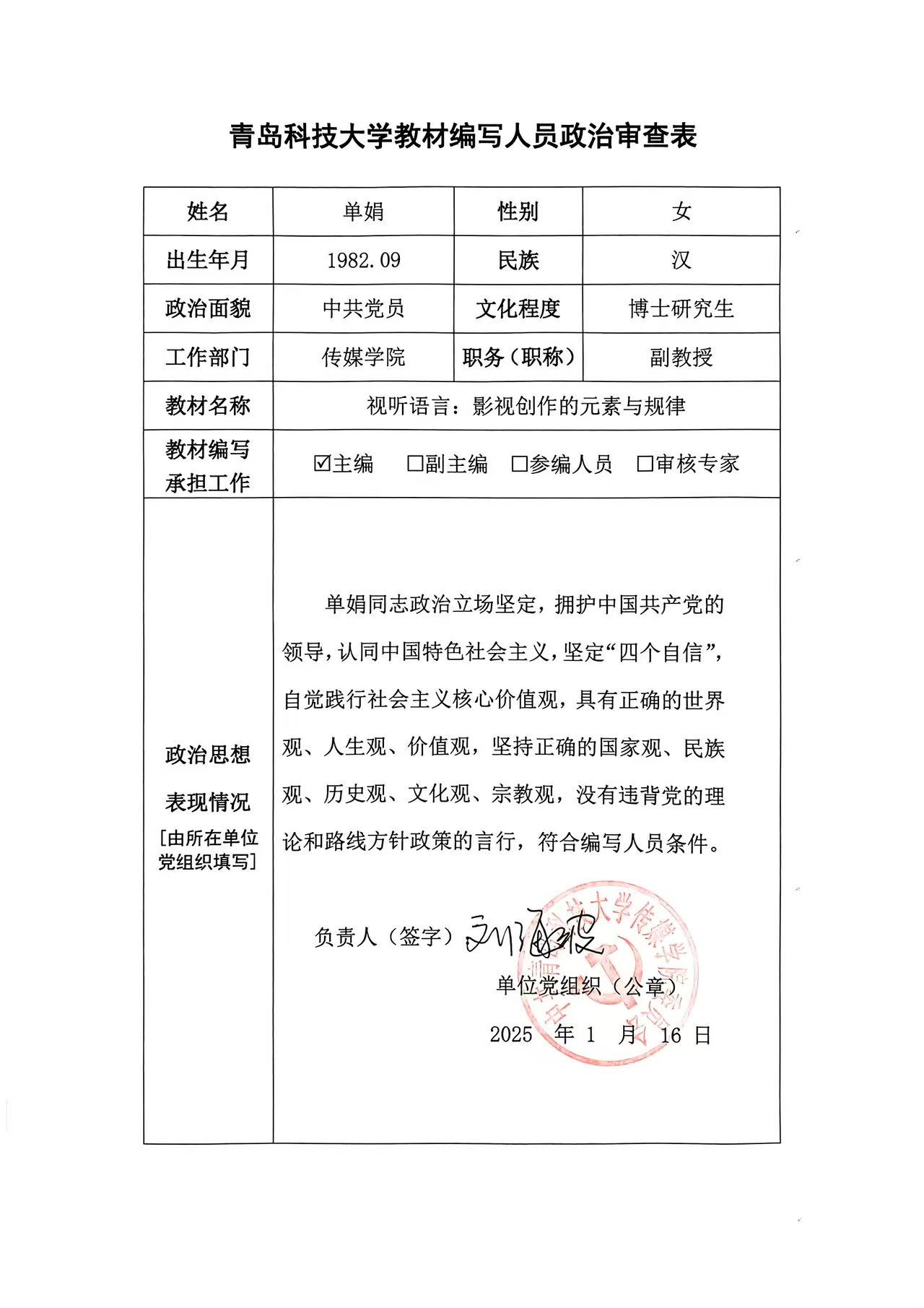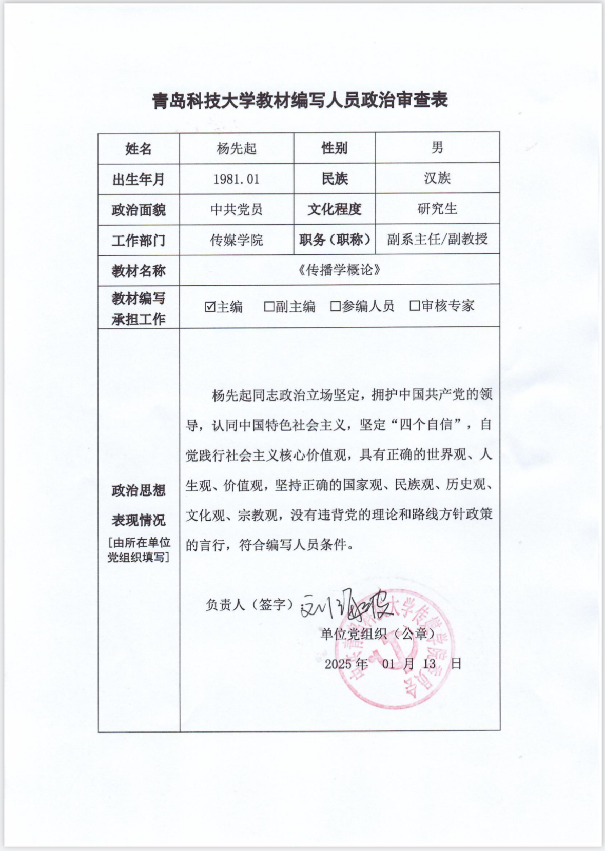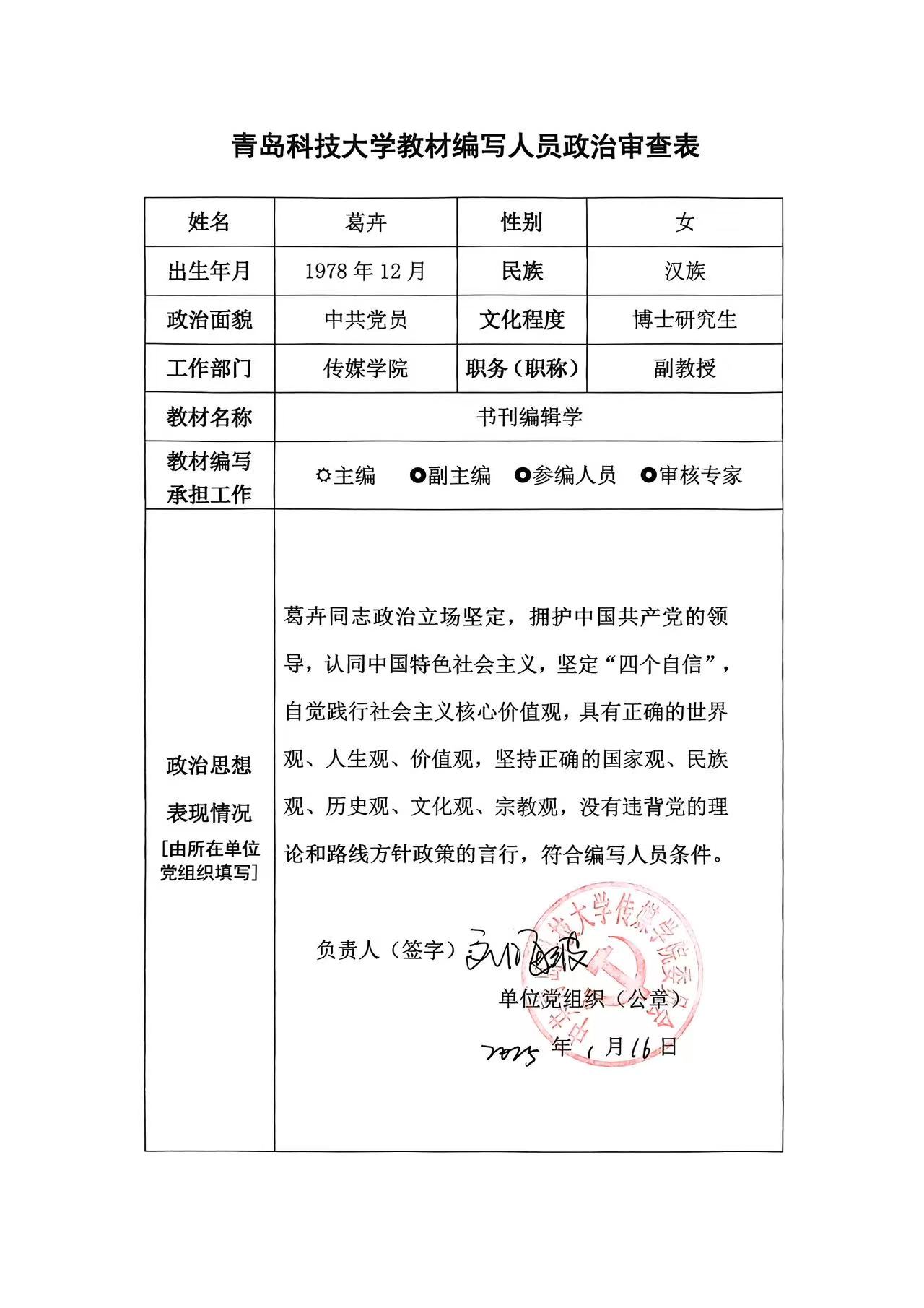 经做爱电影 党委会审核同意,对教材编写人员葛卉、杨先起、单娟政审情况予以公示,公示期为5天(2025年1月16日-20日),如有异议,请在公示期内向做爱电影 教学办反映。