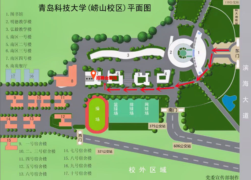 崂山校区东门(松岭路99号)入校后,校内有引导指示牌。