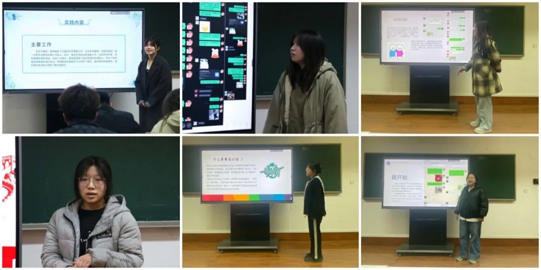 交流会上,社会实践优秀团队代表分别对各自开展的社会实践活动成果进行展示,有参与"趁青春·进社区”大学生社区实践计划、学雷锋·树新风志愿服务活动、“青鸟计划·引凤归巢”实践活动、一起云支教专项活动的多名同学进行分享交流。同学们通过分享实践过程,畅谈实践收获,交流实践展望,用文字、照片、视频等方式分享表达了各自参与社会实践的经历与感悟。