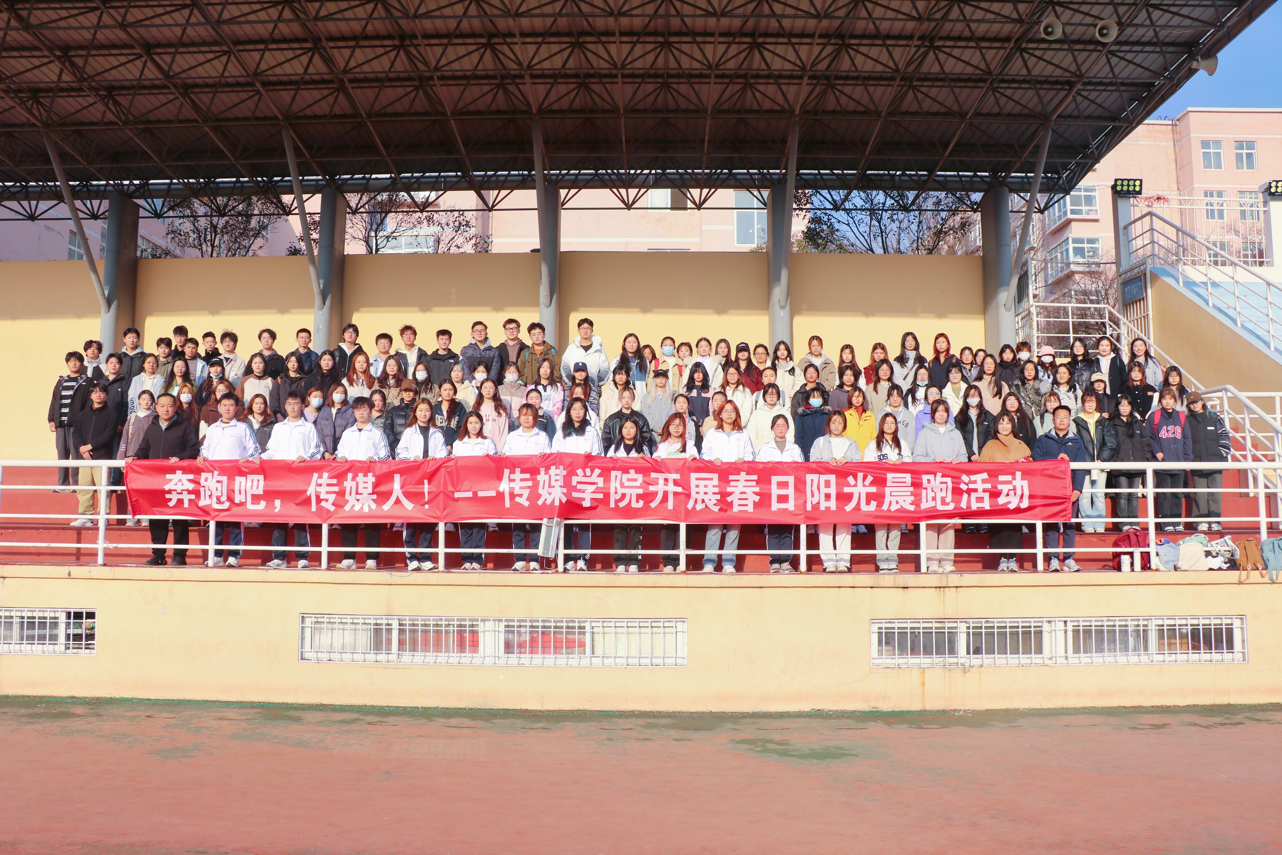 于南苑操场开展“奔跑吧,传媒人!——阳光晨跑活动”,学院学工办主任兼团委书记于杰亮、辅导员张鸣、刘福民及150余位同学参加活动。