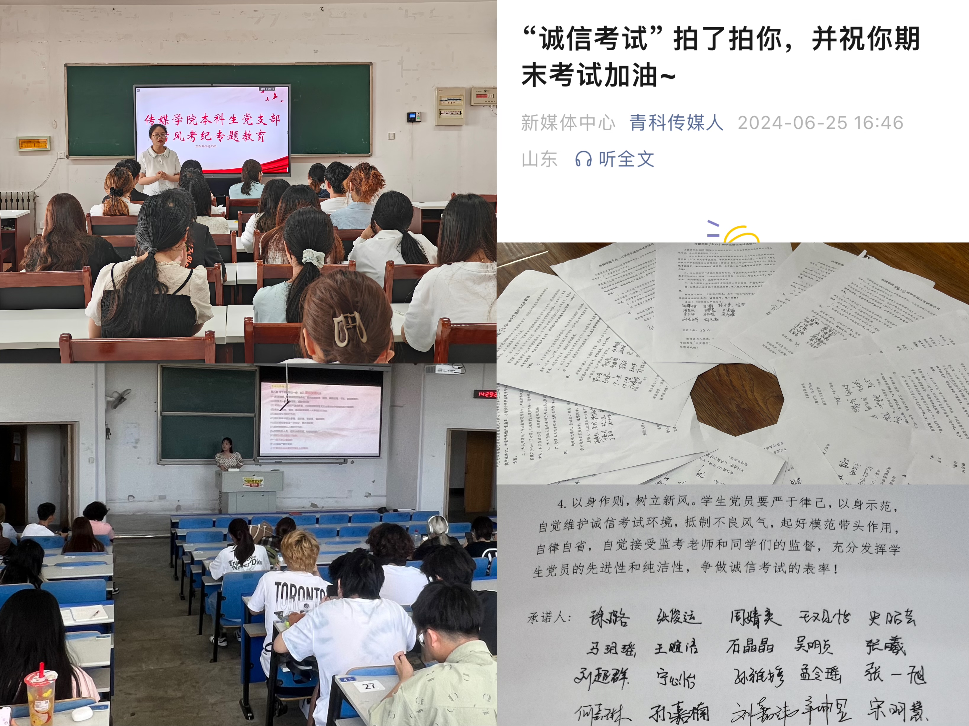 学生纪律处分警示教育案例选编》等相关规定和要求,并集体签订《立党员标杆,做诚信表率--致全体学生党员诚信考试承诺书》,确保党员群体自律诚信、带头践行。抓牢全体学生。各年级辅导员以班会等形式召开考风考纪主题班会,通过对学校相关纪律处分规定的学习和考试违纪作弊案例分析,以及观看《做爱电影
