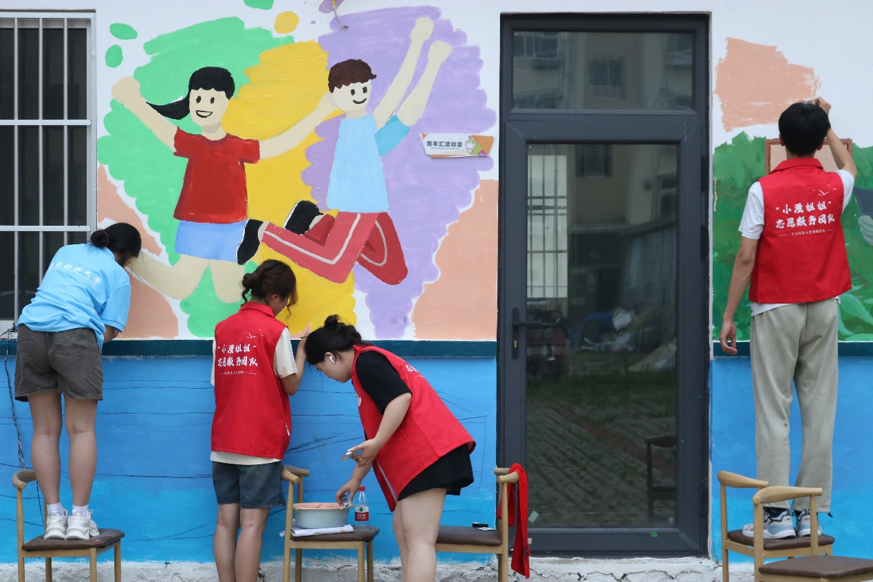 7月18日,“小漫姐姐”志愿服务团队踏上了“团团舞蹈室”的焕新之旅。实践队队员们挥动画笔用线条、色彩、形状和构图将情感与现实连结,在单调的墙面上绘制出了一幅幅生动而又充满魅力的图案,为舞蹈室增添了无限活力。站在色彩斑斓的墙绘前,仿佛踏入一个梦幻般的童话世界,为孩子们营造了一处童真与艺术交织的园地。