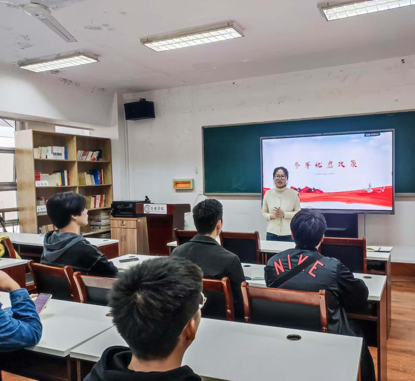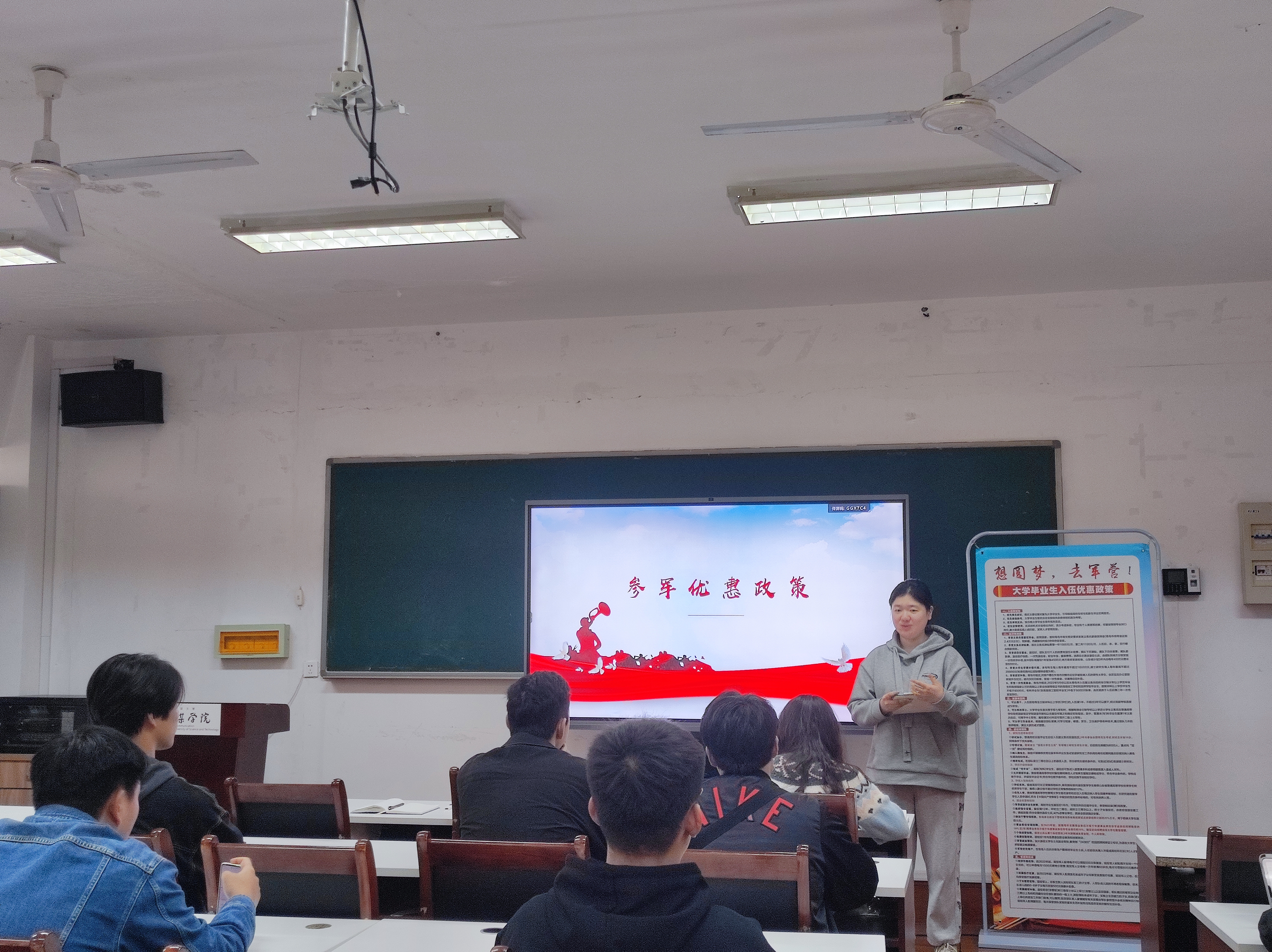 金莹莹强调了国家征兵工作的重要意义,号召青年大学生作为国家的未来和希望,有责任也有义务投身国防事业,为国家的繁荣富强贡献自己的青春力量。同时,详细介绍了当前的征兵入伍政策,包括报名条件、选拔流程、优惠政策等,让同学们对参军入伍有了更加全面和深入的了解。