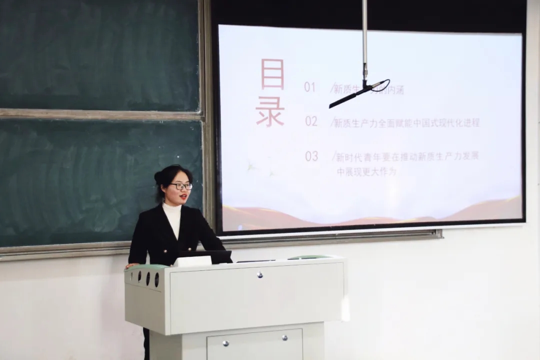 团委副书记兼学工办副主任金莹莹作2023-2024学年秋季学期团校第一讲,为培训学员作主题为“青年要理解新质生产力挺立在时代潮头”的开班第一课。
