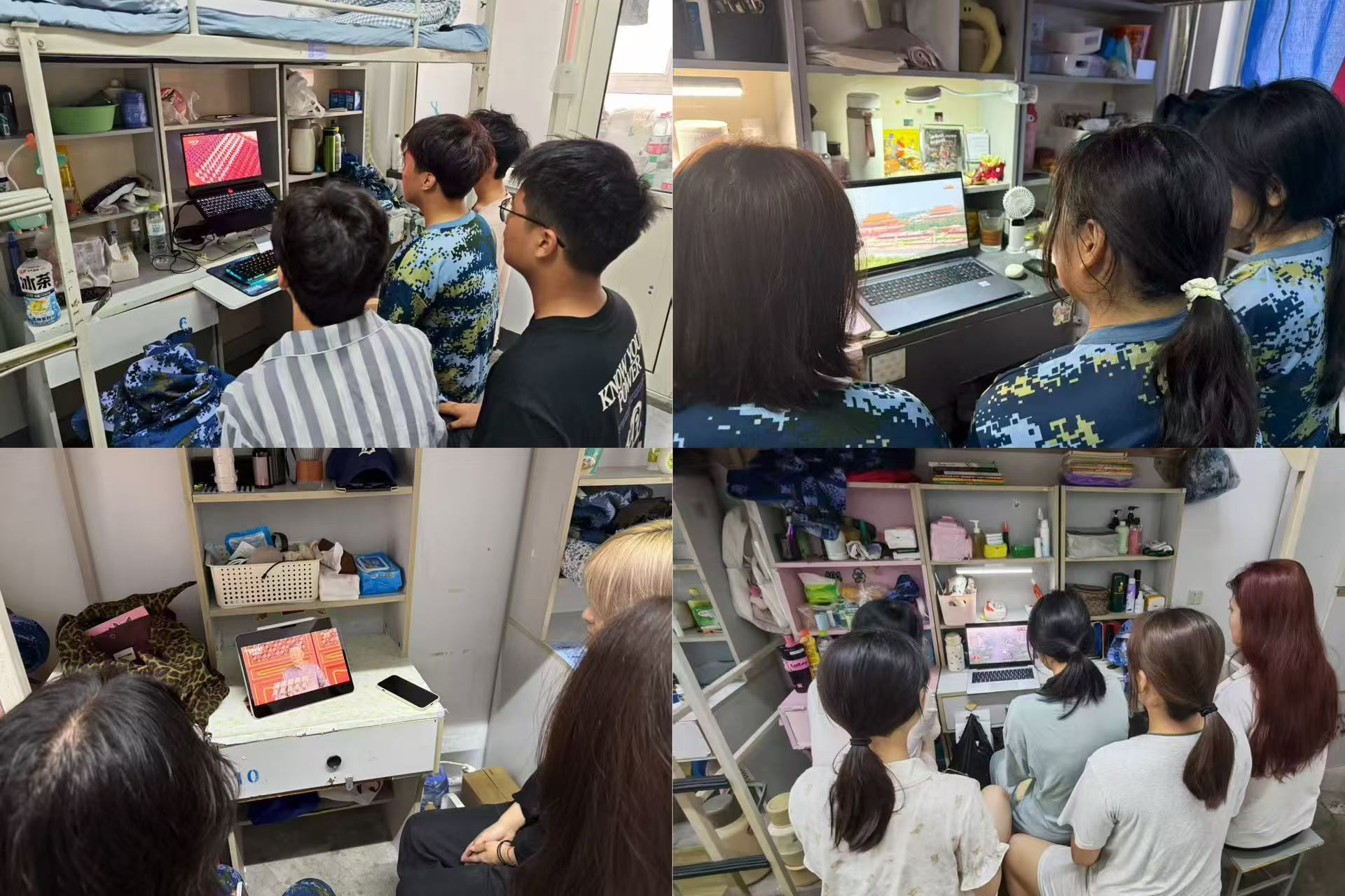 组织2025级本科生以宿舍为单位集体观看了纪念中国人民抗日战争暨世界反法西斯战争胜利80周年阅兵仪式视频。辅导员张凤老师深入学生宿舍,与同学们共同观看精彩瞬间,并亲切慰问新生的入校军训和生活适应情况。这不仅是一次生动的爱国主义教育,更增强了同学们的集体荣誉感和宿舍凝聚力。
